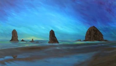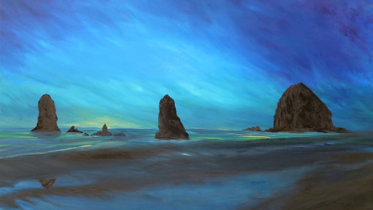 "Dusk at Haystack" One of my favorite subjects, Haystack Rock. My goal was to capture the last light of the day. It was low tide, and the waves were very calm.